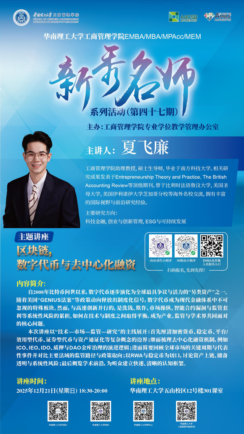 预告|新秀名师系列(第47期)@夏飞廉:区块链,数字代币与去中心化融资