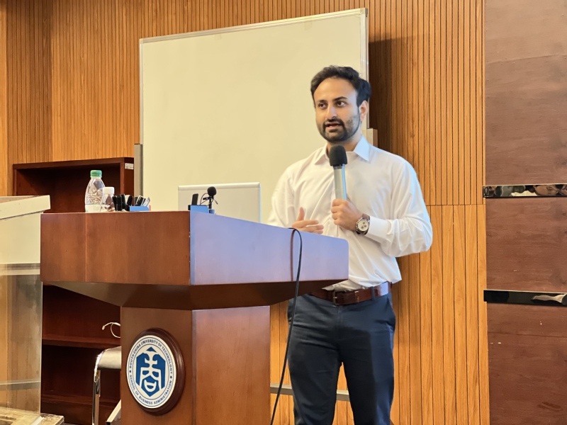 12月13日晚,2025年第二期“一带一路”沿线国家留学生世界文化风情展在12号楼成功举办,本次活动由我院王志强教授主持。我院2025级全日制IMBA班留学生,目前任职德国Mechconnect公司联合创始人、菲尼克斯电气集团产品营销经理Shah Ali Daim Abbas以创新、工程与可持续:刻在德国工业血脉中的DNA为主题,结合自身跨文化学习与职业经历,向在场师生深度解析了德国工业长盛不衰的深层逻辑与实践路径。