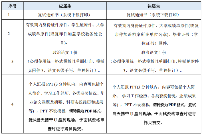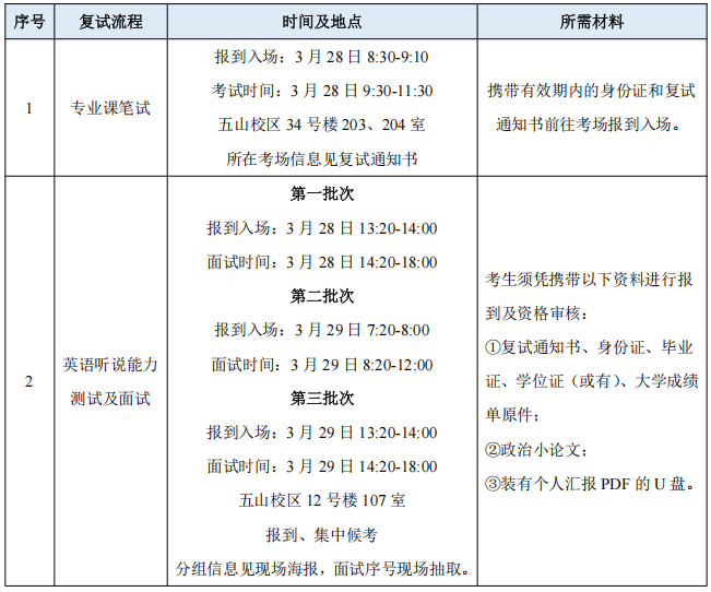 考生须按照复试通知书上的时间和地点,携带相关材料到校进行报到资格审查和复试,相关事项如下:
