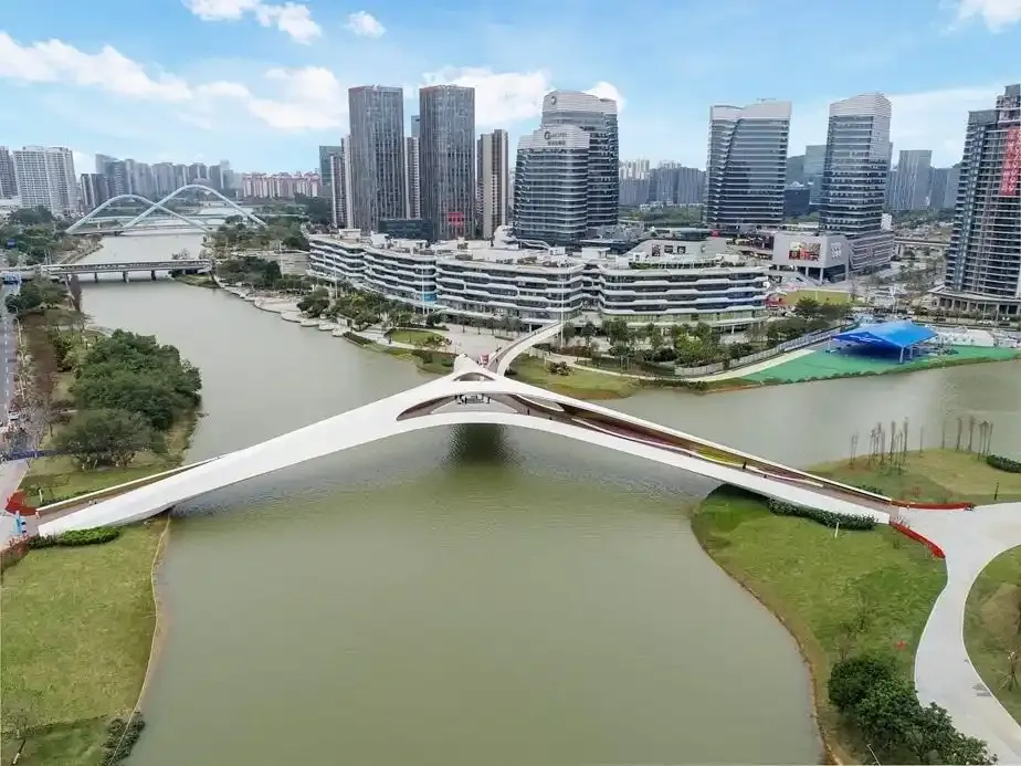 如今,聚星桥已成为南沙的网红打卡点、新地标。桥身旋转曲线交织出的“未来之窗”,不仅是建筑结构的点睛之笔,更象征着粤港澳大湾区三地携手、共创未来的美好愿景。从图纸到现实,建设团队克服了软土地基、复杂节点、超高精度合龙等一系列技术难题,最终将这座“不可能”的桥梁稳稳矗立在蕉门河上。