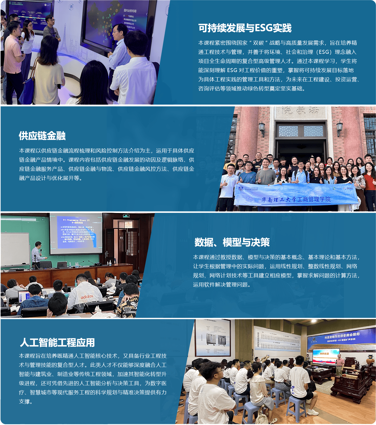 我院工程管理硕士项目以管理科学与工程学科为基础,课程内容具有宽广性、前沿性、综合性和系统性,注重对学生分析能力和创造性解决实际问题能力的培养。